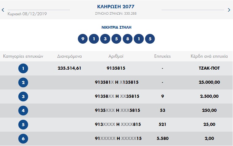 €250.000 τουλάχιστον θα μοιραστούν οι τυχεροί της 1ης κατηγορίας στην επόμενη κλήρωση της ΠΕΜΠΤΗΣ 12/12/2019 μετά το ΤΖΑΚ-ΠΟΤ που σημειώθηκε κατά τη σημερινή διαλογή της 2077ης κλήρωσης του ΠΡΟΤΟ.