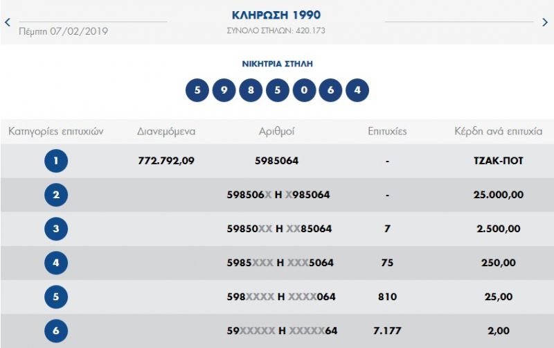 €790.000 τουλάχιστον θα μοιραστούν οι τυχεροί της 1ης κατηγορίας στην επόμενη κλήρωση της ΚΥΡΙΑΚΗΣ 10/02/2019 μετά το ΤΖΑΚ-ΠΟΤ που σημειώθηκε κατά τη σημερινή διαλογή της 1990ης κλήρωσης του ΠΡΟΤΟ.