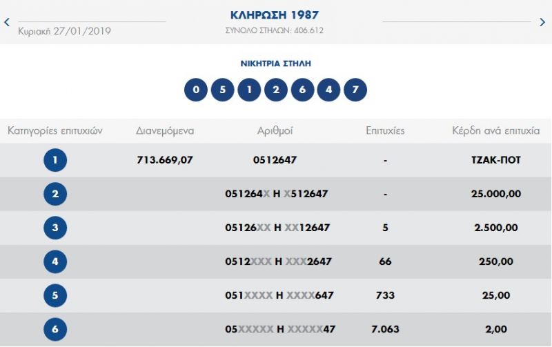 €730.000 τουλάχιστον θα μοιραστούν οι τυχεροί της 1ης κατηγορίας στην επόμενη κλήρωση της ΠΕΜΠΤΗΣ 31/01/2019 μετά το ΤΖΑΚ-ΠΟΤ που σημειώθηκε κατά τη σημερινή διαλογή της 1987ης κλήρωσης του ΠΡΟΤΟ.