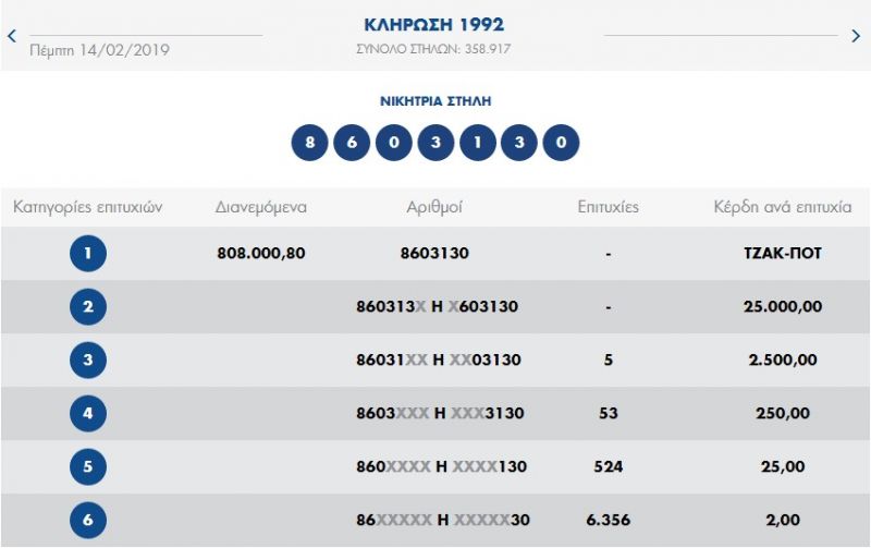 €820.000 τουλάχιστον θα μοιραστούν οι τυχεροί της 1ης κατηγορίας στην επόμενη κλήρωση της ΚΥΡΙΑΚΗΣ 17/02/2019 μετά το ΤΖΑΚ-ΠΟΤ που σημειώθηκε κατά τη σημερινή διαλογή της 1992ης κλήρωσης του ΠΡΟΤΟ.