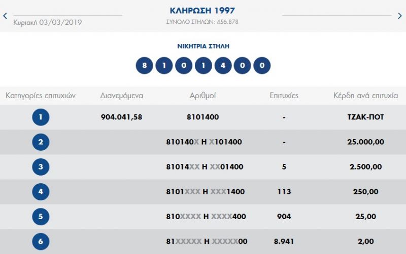 €920.000 τουλάχιστον θα μοιραστούν οι τυχεροί της 1ης κατηγορίας στην επόμενη κλήρωση της ΠΕΜΠΤΗΣ 07/03/2019 μετά το ΤΖΑΚ-ΠΟΤ που σημειώθηκε κατά τη σημερινή διαλογή της 1997ης κλήρωσης του ΠΡΟΤΟ.