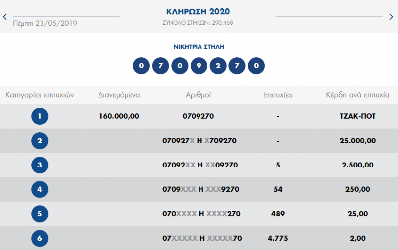 €170.000 τουλάχιστον θα μοιραστούν οι τυχεροί της 1ης κατηγορίας στην επόμενη κλήρωση της ΚΥΡΙΑΚΗΣ 26/05/2019 μετά το ΤΖΑΚ-ΠΟΤ που σημειώθηκε κατά τη σημερινή διαλογή της 2020ης κλήρωσης του ΠΡΟΤΟ.