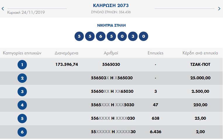 €190.000 τουλάχιστον θα μοιραστούν οι τυχεροί της 1ης κατηγορίας στην επόμενη κλήρωση της ΠΕΜΠΤΗΣ 28/11/2019 μετά το ΤΖΑΚ-ΠΟΤ που σημειώθηκε κατά τη σημερινή διαλογή της 2073ης κλήρωσης του ΠΡΟΤΟ.