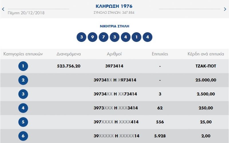 € 540.000 τουλάχιστον θα μοιραστούν οι τυχεροί της 1ης κατηγορίας στην επόμενη κλήρωση της ΚΥΡΙΑΚΗΣ 23/12/2018 μετά το ΤΖΑΚ-ΠΟΤ που σημειώθηκε κατά τη σημερινή διαλογή της 1976ης κλήρωσης του ΠΡΟΤΟ.