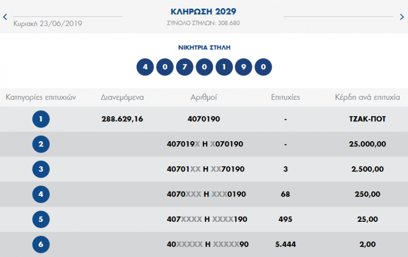 € 300.000 τουλάχιστον θα μοιραστούν οι τυχεροί της 1ης κατηγορίας στην επόμενη κλήρωση της ΠΕΜΠΤΗΣ 27/06/2019 μετά το ΤΖΑΚ-ΠΟΤ που σημειώθηκε κατά τη σημερινή διαλογή της 2029ης κλήρωσης του ΠΡΟΤΟ.