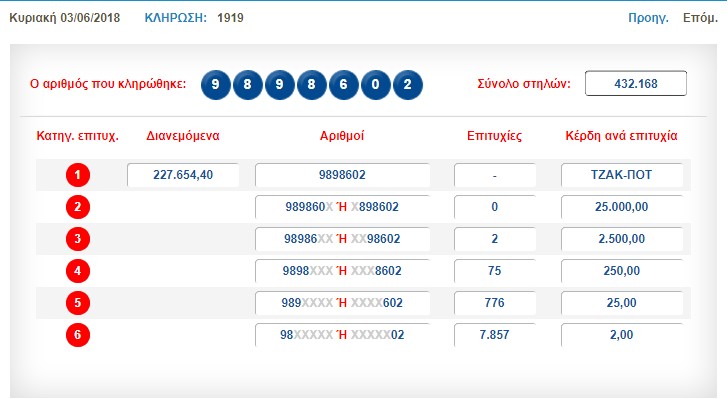 € 240.000 τουλάχιστον θα μοιραστούν οι τυχεροί της 1ης κατηγορίας στην επόμενη κλήρωση της ΠΕΜΠΤΗΣ 07/06/2018 μετά το ΤΖΑΚ-ΠΟΤ που σημειώθηκε κατά τη σημερινή διαλογή της 1919ης κλήρωσης του ΠΡΟΤΟ.