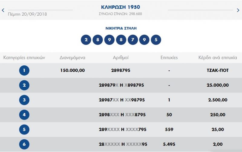 €150.000 τουλάχιστον θα μοιραστούν οι τυχεροί της 1ης κατηγορίας στην επόμενη κλήρωση της ΚΥΡΙΑΚΗΣ 23/09/2018 μετά το ΤΖΑΚ-ΠΟΤ που σημειώθηκε κατά τη σημερινή διαλογή της 1950ης κλήρωσης του ΠΡΟΤΟ.