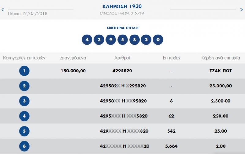 €150.000 τουλάχιστον θα μοιραστούν οι τυχεροί της 1ης κατηγορίας στην επόμενη κλήρωση της ΚΥΡΙΑΚΗΣ 15/7/2018 μετά το ΤΖΑΚ-ΠΟΤ που σημειώθηκε κατά τη σημερινή διαλογή της 1930ης κλήρωσης του ΠΡΟΤΟ.