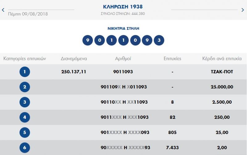 €270.000 τουλάχιστον θα μοιραστούν οι τυχεροί της 1ης κατηγορίας στην επόμενη κλήρωση της ΚΥΡΙΑΚΗΣ 12/08/2018 μετά το ΤΖΑΚ-ΠΟΤ που σημειώθηκε κατά τη σημερινή διαλογή της 1938ης κλήρωσης του ΠΡΟΤΟ.