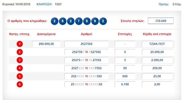 € 270.000 τουλάχιστον θα μοιραστούν οι τυχεροί της 1ης κατηγορίας στην επόμενη κλήρωση της ΠΕΜΠΤΗΣ 14/06/2018 μετά το ΤΖΑΚ-ΠΟΤ που σημειώθηκε κατά τη σημερινή διαλογή της 1921ης κλήρωσης του ΠΡΟΤΟ.