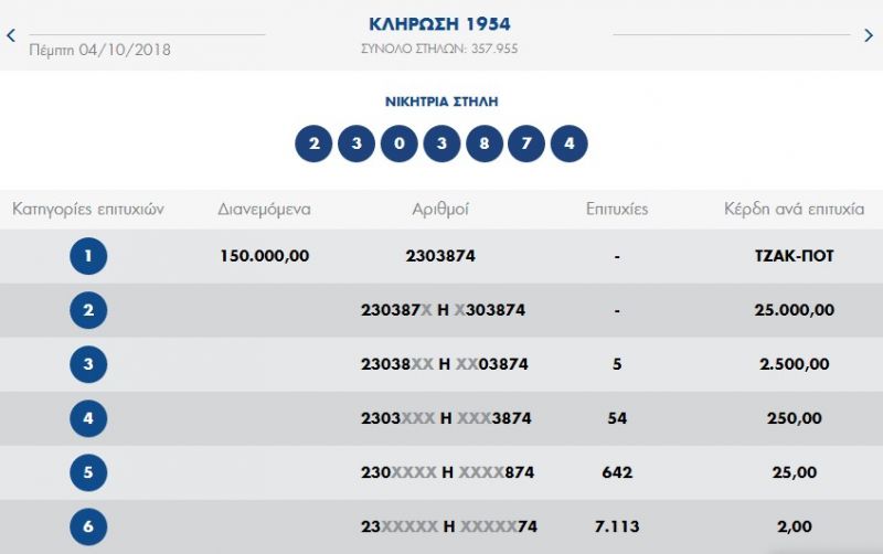 € 150.000 τουλάχιστον θα μοιραστούν οι τυχεροί της 1ης κατηγορίας στην επόμενη κλήρωση της KYΡΙΑΚΗΣ 07/10/2018 μετά το ΤΖΑΚ-ΠΟΤ που σημειώθηκε κατά τη σημερινή διαλογή της 1954ης κλήρωσης του ΠΡΟΤΟ.