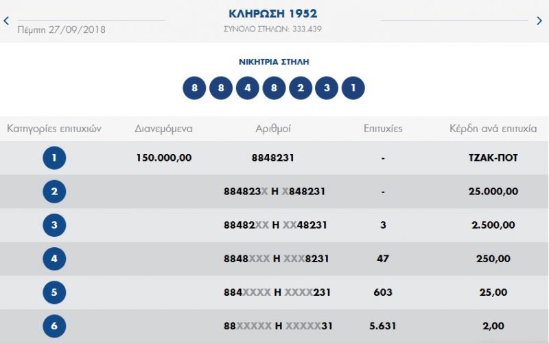 €150.000 τουλάχιστον θα μοιραστούν οι τυχεροί της 1ης κατηγορίας στην επόμενη κλήρωση της ΚΥΡΙΑΚΗΣ 30/09/2018 μετά το ΤΖΑΚ-ΠΟΤ που σημειώθηκε κατά τη σημερινή διαλογή της 1952ης κλήρωσης του ΠΡΟΤΟ.