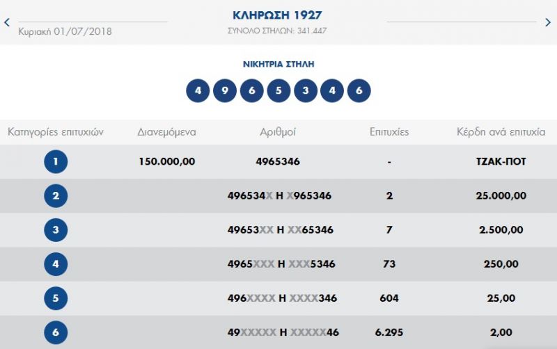 € 150.000 τουλάχιστον θα μοιραστούν οι τυχεροί της 1ης κατηγορίας στην επόμενη κλήρωση της ΠΕΜΠΤΗΣ 05/07/2018 μετά το ΤΖΑΚ-ΠΟΤ που σημειώθηκε κατά τη σημερινή διαλογή της 1927ης κλήρωσης του ΠΡΟΤΟ.