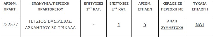 Επίσης στην δεύτερη κατηγορία (6) βρέθηκε ένα (1) τυχερό δελτίο που κερδίζει το ποσό των € 25.000,00.