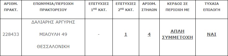 Επίσης στην δεύτερη κατηγορία (6) βρέθηκε ένα (1) τυχερό δελτίο που κερδίζει το ποσό των € 25.000,00.