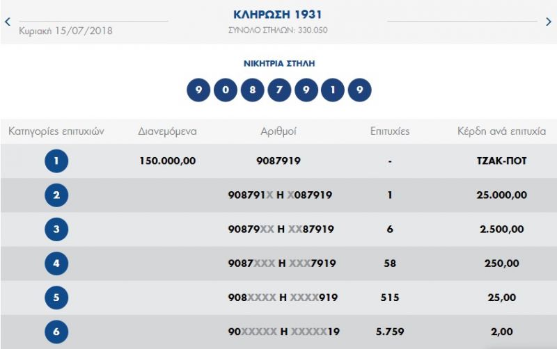 € 150.000 τουλάχιστον θα μοιραστούν οι τυχεροί της 1ης κατηγορίας στην επόμενη κλήρωση της ΠΕΜΠΤΗΣ 19/07/2018 μετά το ΤΖΑΚ-ΠΟΤ που σημειώθηκε κατά τη σημερινή διαλογή της 1931ης κλήρωσης του ΠΡΟΤΟ.