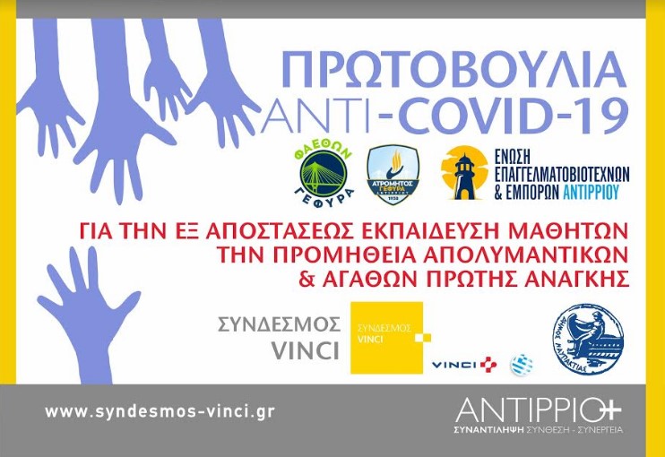 Ο ΣΥΝΔΕΣΜΟΣ VINCI (ελληνικό τμήμα της Fondation VINCI pour la Cité, κοινωνικού βραχίονα του Ομίλου VINCI, κυρίου μετόχου της ΓΕΦΥΡΑ Α.Ε. και της ΟΛΥΜΠΙΑ ΟΔΟΣ Α.Ε.) ανταποκρινόμενος σε πρωτοβουλία τριών συλλόγων του Αντιρρίου και σε συνεννόηση με τον Δήμο Ναυπακτίας, προσφέρει οικονομική υποστήριξη συνολικού ύψους 22.000€ για την προμήθεια φορητών υπολογιστών (tablets & laptops) για α) τη μέσω διαδικτύου εκπαίδευση των μαθητών δημοτικών και γυμνασίων της περιοχής, β) απολυμαντικών για οικιακή και δημόσια χρήση, καθώς και γ) προμήθεια τροφίμων για άπορους πολίτες.