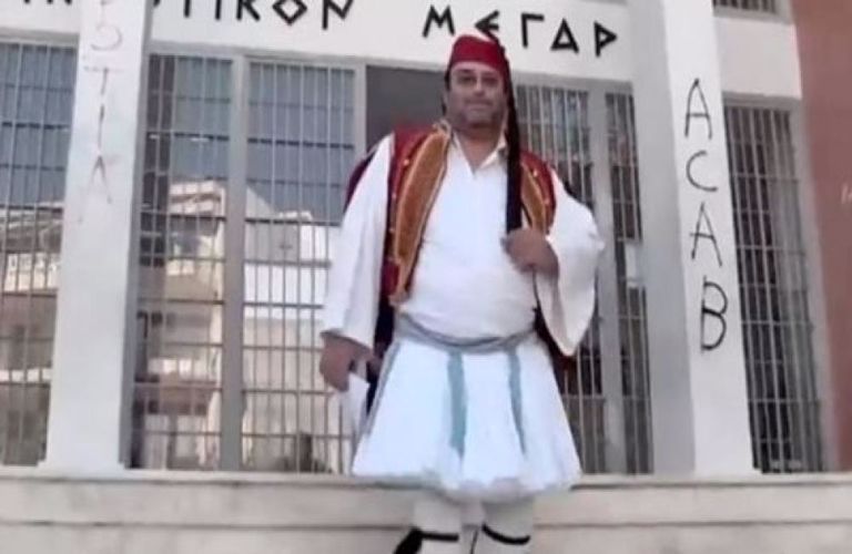 Με την εθνική ενδυμασία του… τσολιά έφτασε συνοδευόμενος από αστυνομικούς του Τμήματος Ασφαλείας Πύργου, αρνητής γονέας. Κατηγορείται για παραβίαση των μέτρων προστασίας από τον κορωνοϊό, συκοφαντική δυσφήμιση και εξύβριση μέσω του διαδικτύου.