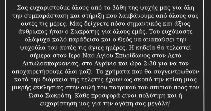 Αντί στεφάνων ζητά να κατατεθούν χρήματα, ώστε στο πατρικό σπίτι του ανθρώπου που συμπορεύθηκε και δημιούργησε μια αξιοθαύμαστη οικογένεια, να χτιστεί μια μικρή εκκλησία αφιερωμένη στον Όσιο Σωκράτη.