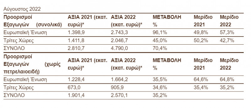 Αναλυτικότερα, σύμφωνα με ανάλυση του Πανελληνίου Συνδέσμου Εξαγωγέων και του Κέντρου Εξαγωγικών Ερευνών και Μελετών (Κ.Ε.Ε.Μ.), επί των προσωρινών στοιχείων της ΕΛ.ΣΤΑΤ., πολύ μεγάλη άνοδο καταγράφει η πορεία των εξαγωγών κατά το μήνα Αύγουστο του 2022 καθώς οι εξαγωγές αυξήθηκαν κατά 1,98 δισ. ευρώ ή κατά 70,4% και ανήλθαν σε 4,79 δισ. ευρώ έναντι 2,81 δισ. ευρώ κατά τον ίδιο μήνα του έτους 2021. Εξαιρουμένων των πετρελαιοειδών, η αύξηση είναι μικρότερη κατά το ήμισυ, καθώς ανήλθαν στα 2,57 δισ. ευρώ από 1,9 δισ. ευρώ, δηλαδή αυξήθηκαν κατά 668,7 εκατ. ευρώ ή κατά 35,2%, γεγονός που επιβεβαιώνει τη μεγάλη σημασία που διαδραματίζει η σημαντικότατη αύξηση των ελληνικών εξαγωγών πετρελαιοειδών και καυσίμων κατά 153,5%.