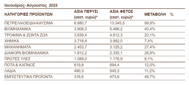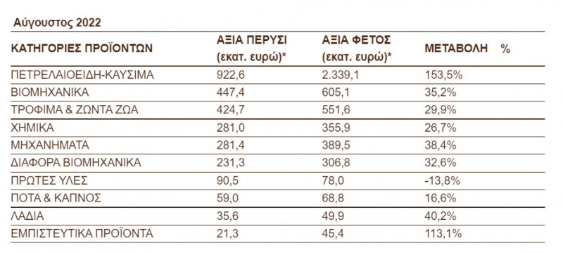 Σχετικά με τις μεγάλες κατηγορίες προϊόντων, τον Αύγουστο του 2022 καταγράφονται ανοδικές τάσεις σε όλους τους κλάδους, με εξαίρεση τον κλάδο των πρώτων υλών.