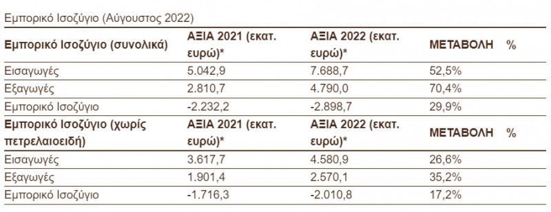 Ως αποτέλεσμα των παραπάνω κινήσεων, το εμπορικό έλλειμμα αυξήθηκε τον Αύγουστο του 2022 κατά 666,5 εκατ. ευρώ, ή κατά 29,9%, στα -2,90 δισ. ευρώ από -2,23 δισ. ευρώ τον αντίστοιχο μήνα του 2021. Χωρίς τα πετρελαιοειδή, το εμπορικό έλλειμμα επίσης αυξήθηκε, στα -2,01 δισ. ευρώ από -1,72 δισ. ευρώ, δηλαδή κατά 294,5 εκατ. ευρώ ή κατά 17,2%.