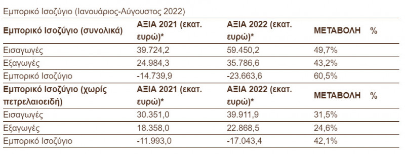 Ως αποτέλεσμα των παραπάνω, το εμπορικό έλλειμμα στο διάστημα Ιανουαρίου-Αυγούστου του 2022 αυξήθηκε κατά 8,92 δισ. ευρώ ή κατά 60,5%, στα -23,66 δισ. ευρώ από -14,74 δισ. ευρώ το αντίστοιχο διάστημα του 2021. Χωρίς τα πετρελαιοειδή, το εμπορικό έλλειμμα αυξήθηκε στα -17,04 δισ. ευρώ από -11,99 δισ. ευρώ, δηλαδή αυξήθηκε κατά 5,05 δισ. ευρώ ή κατά -42,1%.