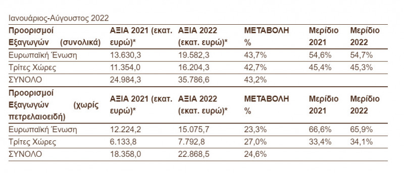 Εξετάζοντας την κατανομή των εξαγωγών για το διάστημα Ιανουαρίου-Αυγούστου του 2022, διαπιστώνεται ότι η συνολική αξία των εξαγωγών, συμπεριλαμβανομένων των πετρελαιοειδών, αυξήθηκε προς τις Χώρες της Ε.Ε. (+43,7%) ενώ σχεδόν εξίσου (+42,7%) αυξήθηκε και προς τις Τρίτες Χώρες. Χωρίς τα πετρελαιοειδή, οι εξαγωγές καταγράφουν άνοδο προς τις Χώρες της ΕΕ κατά 23,3% και μεγαλύτερη άνοδο προς τις Τρίτες Χώρες κατά 27%.