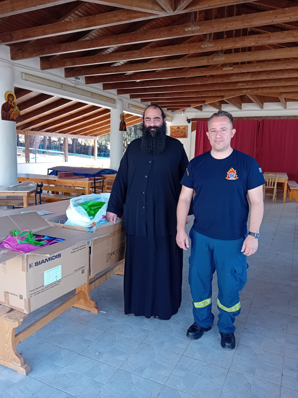 Τα παιχνίδια παρέδωσε ο Προϊστάμενος του Γραφείου Πυρασφάλειας Ν. Αιτωλοακαρνανίας Αντιπύραρχος Βασίλειος Μαδιάς στον υπεύθυνο της κατασκήνωσης Αρχιμανδρίτη Ιωσήφ Ζωγράφο.
