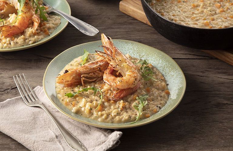 Μοιράζουμε το ριζότο σε 2 πιάτα, τοποθετούμε από πάνω 2 ολόκληρες γαρίδες, και πασπαλίζουμε με ρόκα, πιπέρι και σταγόνες ελαιόλαδου.