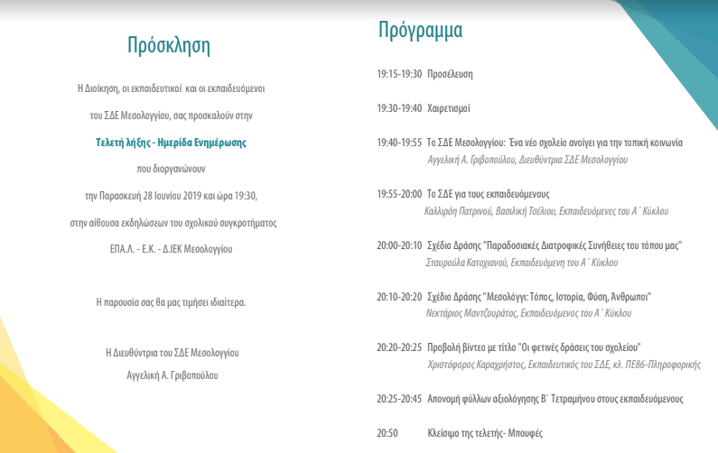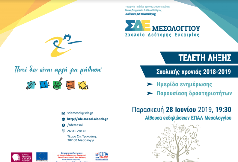 Το Σχολείο Δευτέρης Ευκαιρίας Μεσολογγίου διοργανώνει τη τελετή λήξης της Σχολικής χρονιάς 2018-2019 με ημερίδα ενημέρωσης και παρουσίαση δραστηριοτήτων.