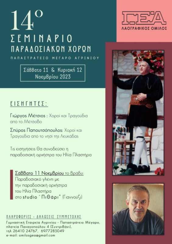 Ο Λαογραφικός Όμιλος της Γυμναστικής Εταιρείας Αγρινίου (Γ.Ε.Α.), συνεχίζοντας μια παράδοση δεκατριών ετών, διοργανώνει φέτος το 14ο σεμινάριο παραδοσιακών χορών το Σάββατο και Κυριακή 11-12 Νοεμβρίου 2023 στο Παπαστράτειο Μέγαρο Αγρινίου.