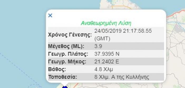 Το επίκεντρο εντοπίζεται 8 χλμ. ανατολικά της Κυλλήνης και το εστιακό βάθος υπολογίζεται στα 8 χλμ.