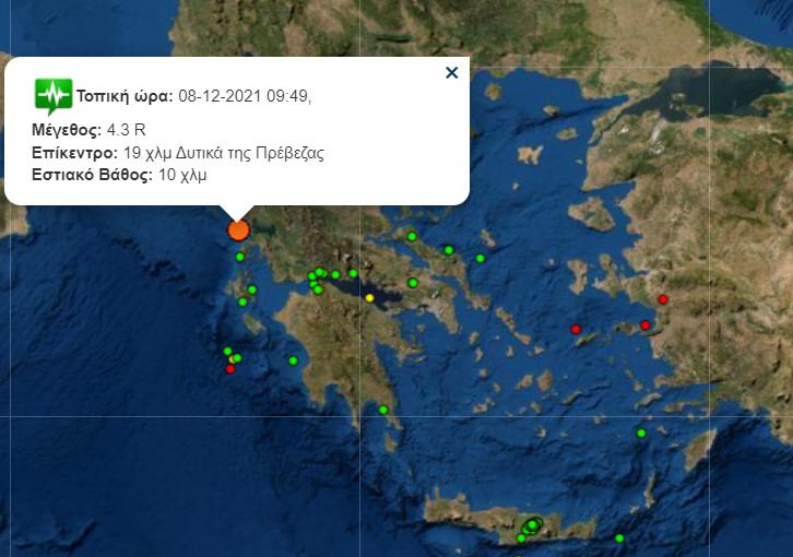 Στις 09:49 το πρωί της Τετάρτης, 8 Δεκεμβρίου 2021 σημειώθηκε σεισμική δόνηση μεγέθους 4,3 βαθμών της κλίμακας Ρίχτερ, 19 χιλιόμετρα Δυτικά της Πρέβεζας, με εστιακό βάθος 10 χιλιομέτρων.