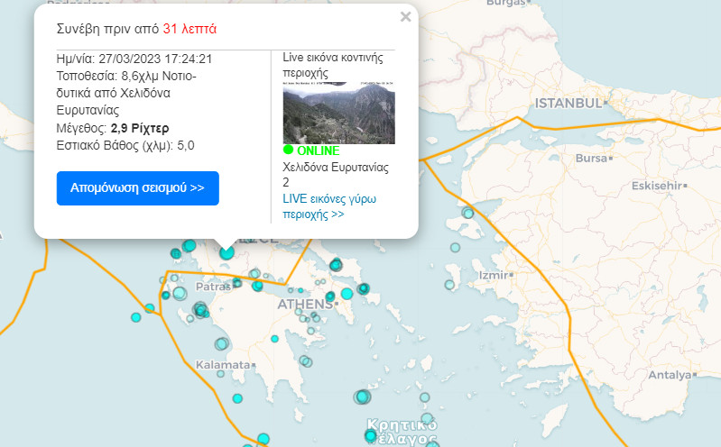 Σεισμική δόνηση 2,9 βαθμών της κλίμακας Ρίχτερ σημειώθηκε στις 17:24 το απόγευμα της Δευτέρας, 27 Μαρτίου 2023 σύμφωνα με το Γεωδυναμικό Ινστιτούτο του Αστεροσκοπείου Αθηνών.