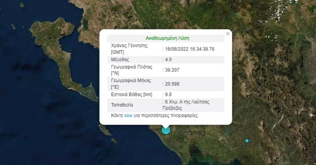 Ο σεισμός των 4R στην Πρέβεζα έχει επίκεντρο την περιοχή Λούτσα, σύμφωνα με το Γεωδυναμικό Ινστιτούτο του Εθνικού Αστεροσκοπείου Αθηνών.