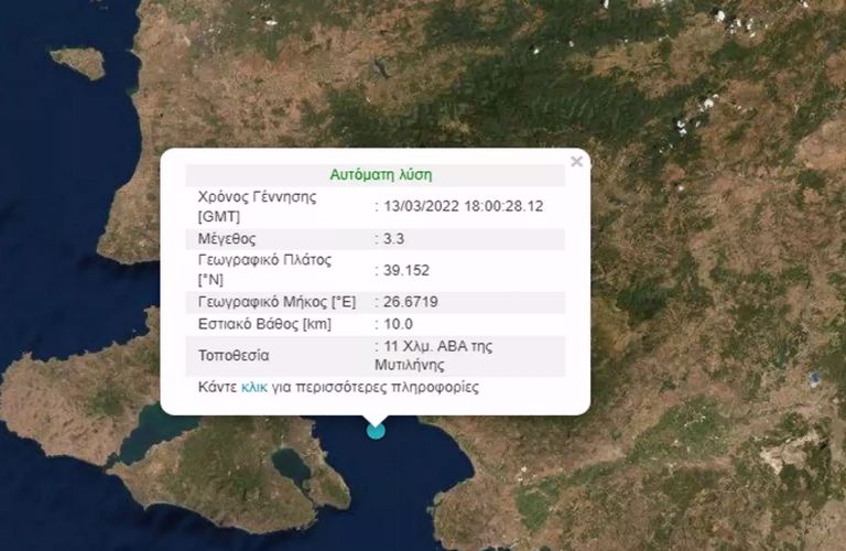 Σεισμός σημειώθηκε κοντά στη Μυτιλήνη στις 8 το βράδυ της Κυριακής (13.03.2022). Το επίκεντρο σε απόσταση μόλις 11 χιλιομέτρων ανατολικά – βορειοανατολικά του νησιού.
