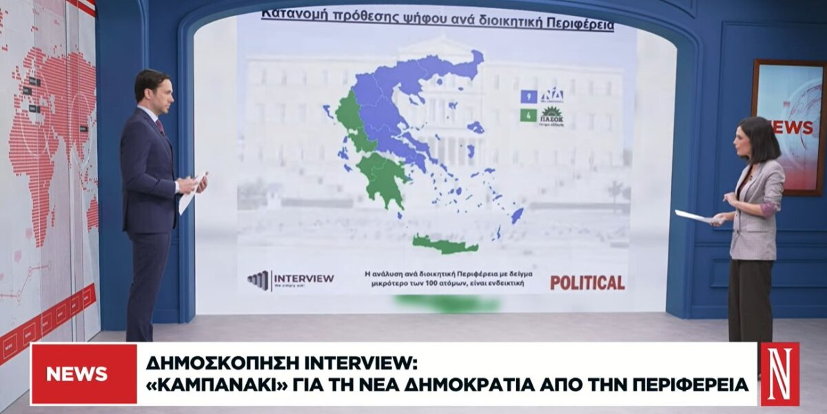 Η έρευνα της Interview πραγματοποιήθηκε το διάστημα 6–10 Νοεμβρίου 2025, αποτυπώνοντας μια Ελλάδα με διακριτές γεωγραφικές και κοινωνικές αντιθέσεις: μια Περιφέρεια που απομακρύνεται από τη Ν.Δ. και ένα κατερματισμένο πολιτικό σκηνικό όπου η φωνή της δυσαρέσκειας ακούγεται όλο και πιο καθαρά.