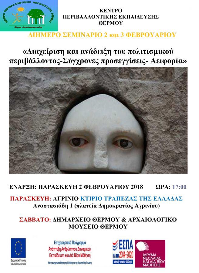 Το Κ.Π.Ε. Θέρμου σε συνεργασία με το Τμήμα Διαχείρισης Πολιτισμικού Περιβάλλοντος και Νέων Τεχνολογιών του Πανεπιστημίου Πατρών και σύμφωνα με τον προγραμματισμό της παιδαγωγικής του ομάδας στο πλαίσιο της Πράξης «Κέντρα Περιβαλλοντικής Εκπαίδευσης (Κ.Π.Ε.) – Περιβαλλοντική Εκπαίδευση», το οποίο υλοποιείται μέσω του Επιχειρησιακού Προγράμματος «Ανάπτυξη Ανθρώπινου Δυναμικού, Εκπαίδευση και Δια Βίου Μάθηση», άξονας προτεραιότητας 6, στις Περιφέρειες ΛΑΠ, με τη συγχρηματοδότηση της Ελλάδας και της Ευρωπαϊκής Ένωσης, προγραμματίζει τη διοργάνωση διήμερου εισαγωγικού επιμορφωτικού σεμιναρίου, Α΄ επιπέδου, στην Περιβαλλοντική Εκπαίδευση στις 2 και 3 Φεβρουαρίου του 2018, με θέμα: «Διαχείριση και ανάδειξη του πολιτισμικού περιβάλλοντος-Σύγχρονες προσεγγίσεις- Αειφορία».