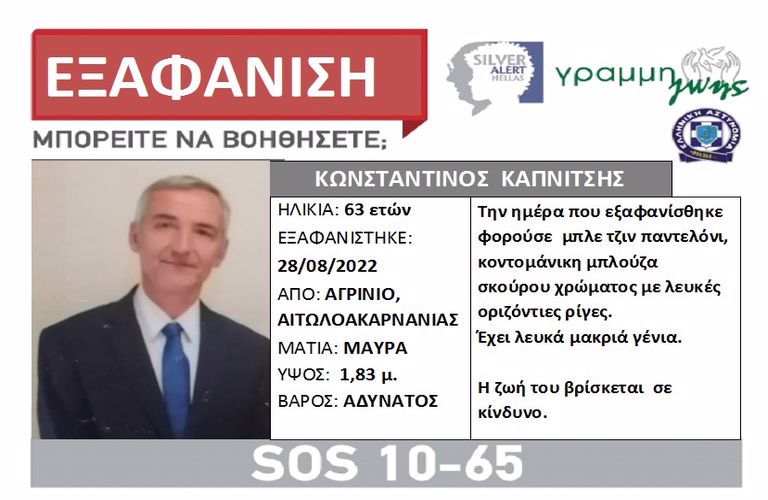 Ο Κωνσταντίνος Καπνίτσης 63 χρόνων, δεν έχει δώσει σημάδι ζωής από την Κυριακή, 28 Αυγούστου όταν χάθηκε από την περιοχή του Αγίου Κωνσταντίνου, στο Αγρίνιο Αιτωλοακαρνανίας.