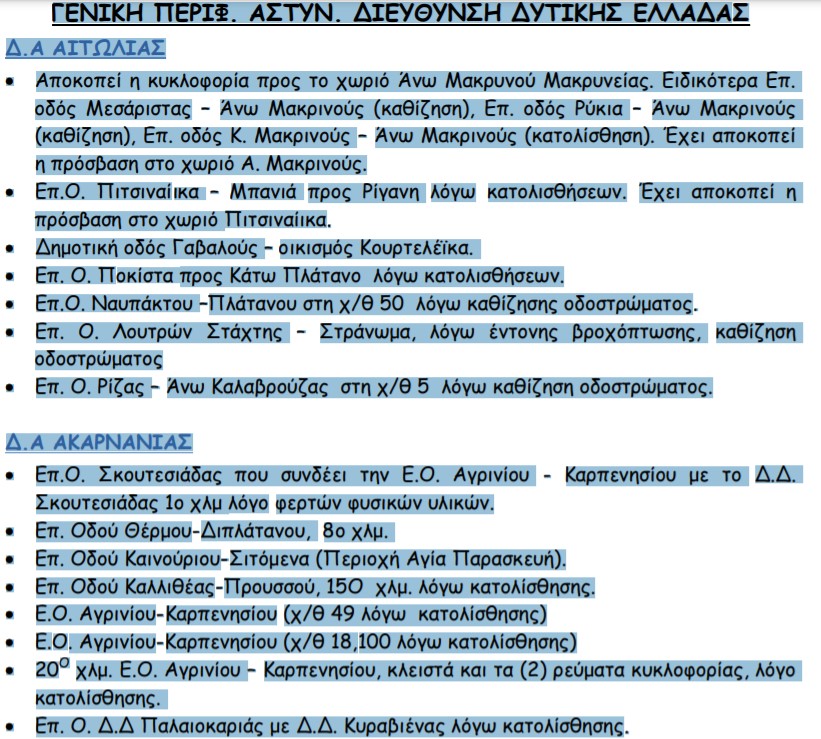 Τα σημεία που έχει διακοπεί η κυκλοφορία στην Αιτωλ/νία (Νεότερη Ενημέρωση)