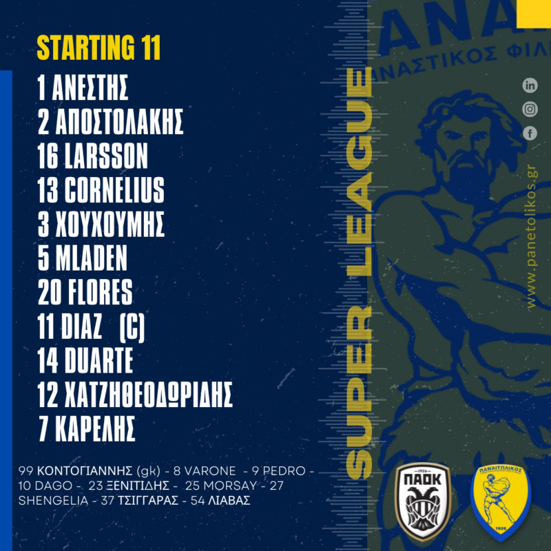 Super League 1: Οι ενδεκάδες του αγώνα Π.Α.Ο.Κ. – Παναιτωλικός