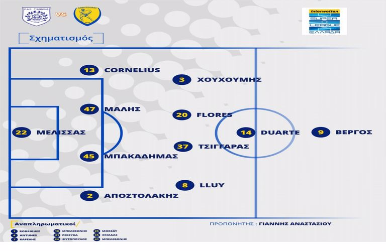 Στον πάγκο για τους αναπληρωματικούς: Ροντρίγκεζ, Αντούνες, Καρέλης, Μπελεβώνης Χρ., Περέιρα, Φυτόπουλος, Μόρσεϊ, Σκιαδάς, Μπελεβώνης Στ.