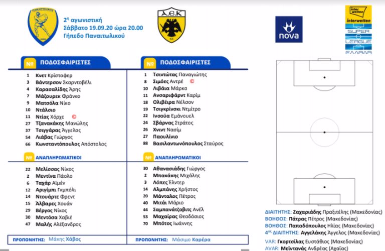 SL1: Οι ενδεκάδες του Παναιτωλικός – Α.Ε.Κ.