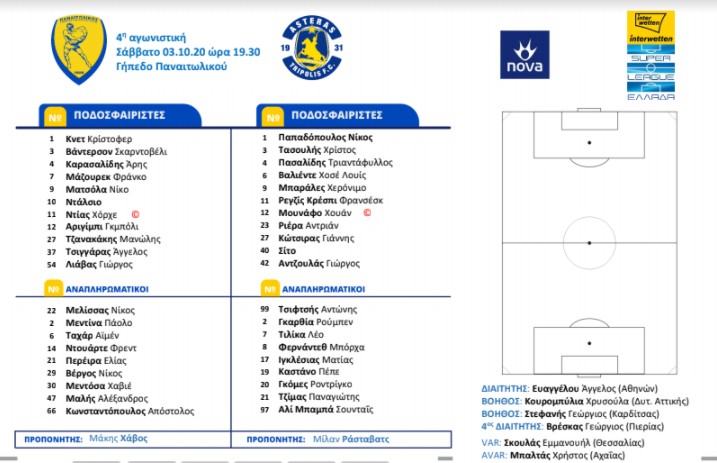 SL1: Οι ενδεκάδες του Παναιτωλικός – Αστέρας Τρίπολης
