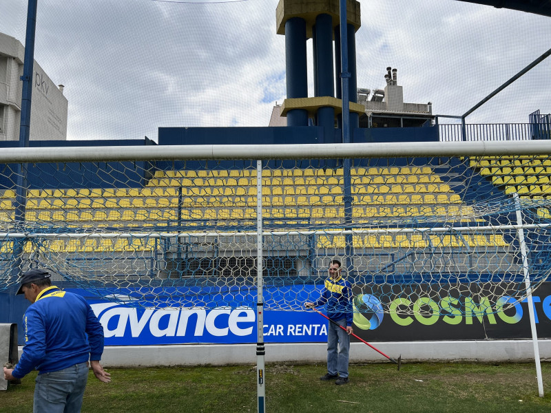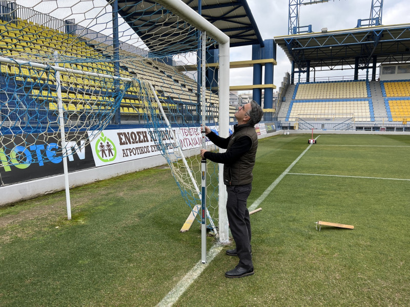 Μέτρηση του ύψους των τερμάτων με μετρητική ράβδο, πριν την αναμέτρηση σύμφωνα με την μέθοδο που ορίζεται από τους διεθνείς κανονισμούς.