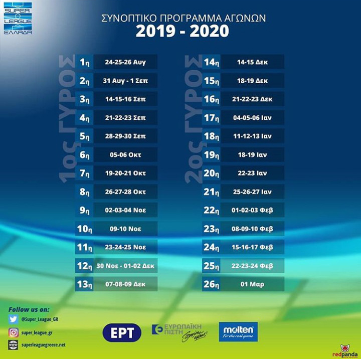 H Super League έδωσε στη δημοσιότητα τις ημερομηνίες που θα διεξαχθούν οι 26 αγωνιστικές της κανονικής περιόδου του νέου πρωταθλήματος. Η αρχή γίνεται το Σάββατο 24 Αυγούστου και η αυλαία πέφτει την Κυριακή 1η Μαρτίου. Αυτό που μένει τώρα είναι η κλήρωση των αγώνων που θα γίνει την ερχόμενη Τρίτη και στη συνέχεια τα κανάλια θα επιλέξουν ακριβείς μέρες και ώρες για τις μεταδόσεις τους.