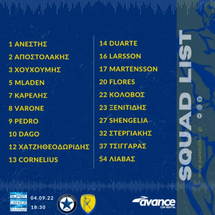 Στην αποστολή του εκτός έδρας αγώνα με τον Ατρόμητο συμμετέχουν οι Ποδοσφαιριστές: