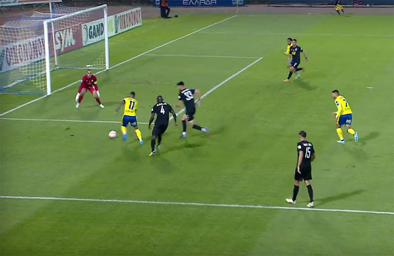 Μόλις στο 7′ και μετά από ωραία μακρινή μεταβίβαση του Χουχούμη ο Ουρουγουανός βρέθηκε μεταξύ των γραμμών της Λαμίας και την κατάλληλη στιγμή «έκοψε» για τον Καρέλη που ακολουθούσε σαν «τρέιλερ» και με τη σειρά του πλάσαρε εύστοχα τον Σαράνοφ. Στο 27′ «κουβάλησε» την μπάλα πολλά μέτρα, «βρέθηκε» με τον Ελληνα επιθετικό και όταν ο γκολκίπερ των γηπεδούχων θέλησε να τον «καλύψει» εκείνος «έκοψε» για τον Καρέλη που ανατράπηκε από τον Ντε Βινσέντι. Ο ρέφερι υπέδειξε πέναλτι, το VAR «συμφώνησε» και ο τελευταίος ευστόχησε από τα 11 βήματα.
