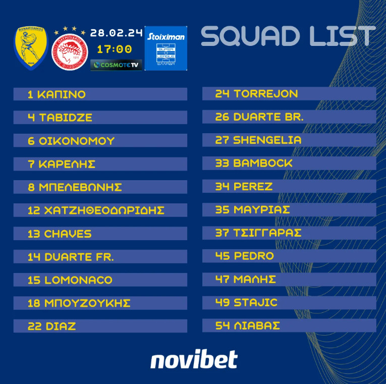 Στην αποστολή του αυριανού αγώνα πρωταθλήματος με τον Ολυμπιακό συμμετέχουν οι Ποδοσφαιριστές: